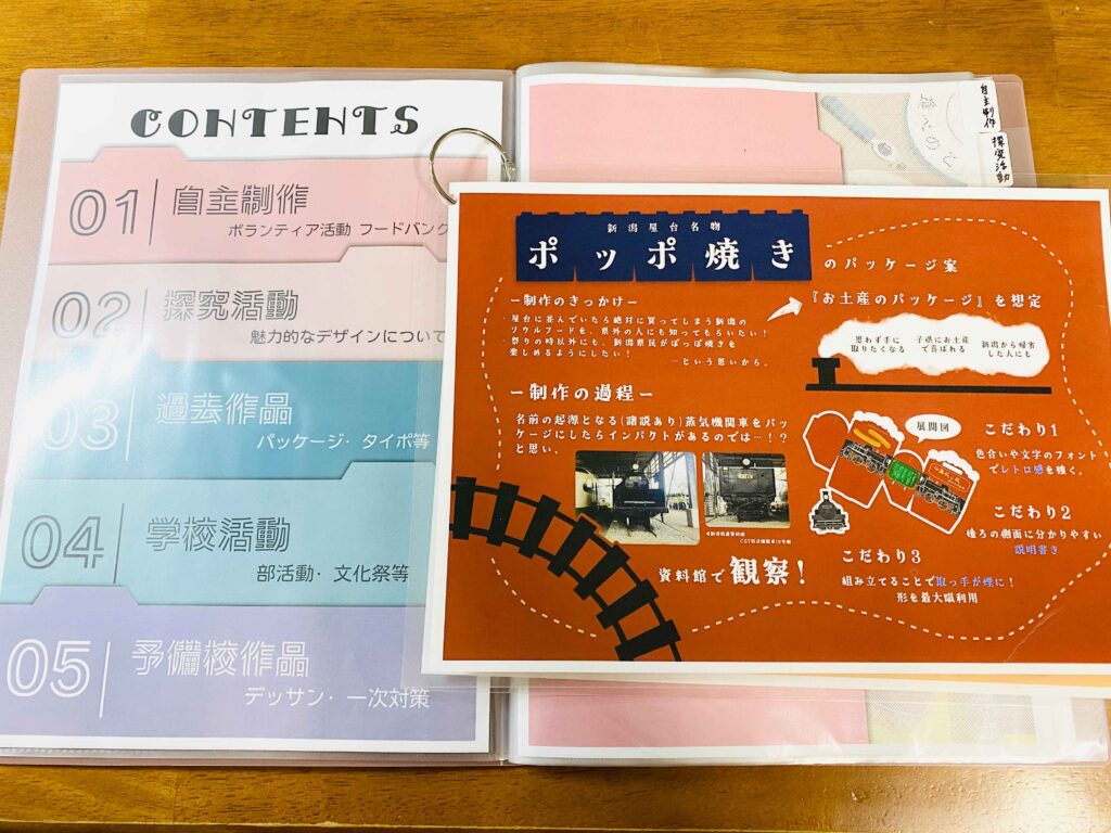 何か1つ自分の中で特にやりたいデザインを決めると志望理由書や自己PR用紙、持ち込み作品もそれに沿って書く・作る事が出来ると思います。自分の作品を色んな先生、友達、親に見てもらい、改善を重ねることも大事です!そういった過程もポートフォリオ等に載せられるので客観的な意見を大切にしてほしいです。